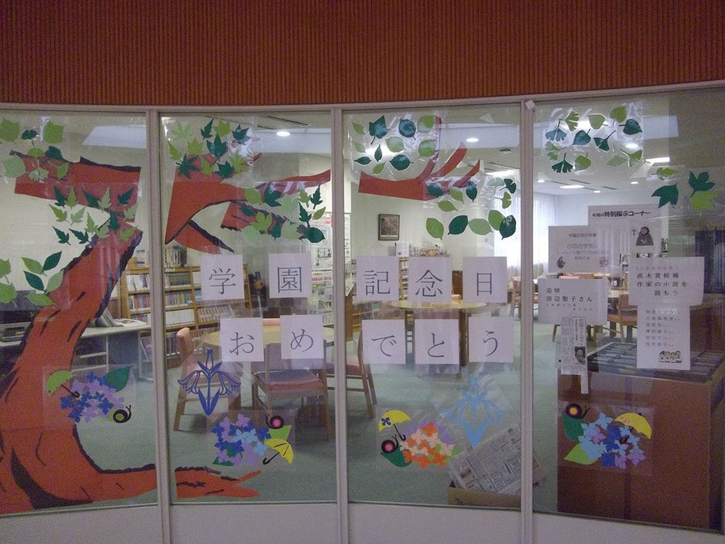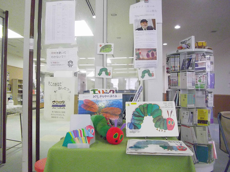 図書館正面は季節に合わせた飾り付けで展示とお知らせが貼ってあります。