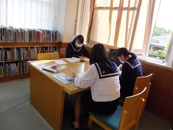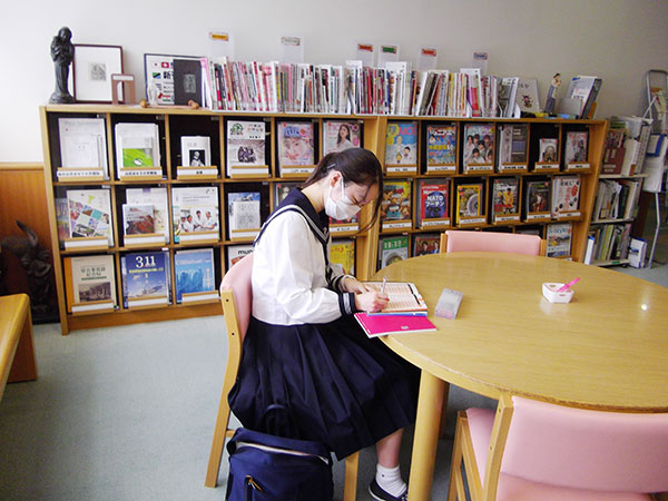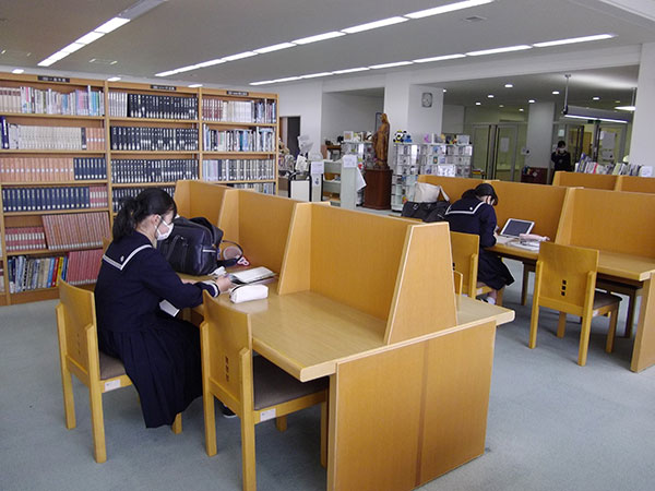 仙台白百合学園の図書館は職員室の隣にあり、常に人の出入りがある場所です。7万冊の図書(消耗図書を含む)、26種類の雑誌、7紙の新聞、2200点のAV資料を利用することにより、ゆたかな人間性を養い、生涯学習の基礎としての自ら学ぶ意欲を育てることを目標にしています。